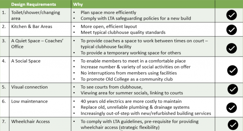 Our current Clubhouse has been approaching the end of its usable life for many years. It was also built in 1984 for a smaller club with fewer teams and a less active junior and adult tennis programme. It is only thanks to the diligence and expertise of our facilities team (John Barton and Hamid Irshad) that its ageing infrastructure keeps going and we are all very aware that the bar and social scene is not what members want it to be.