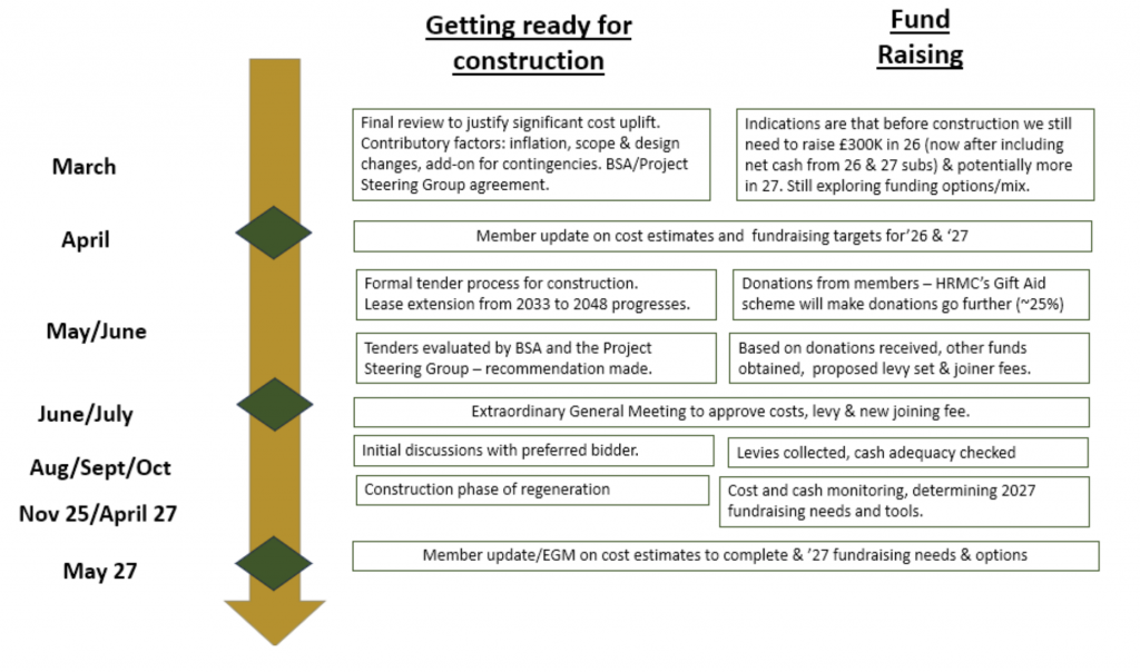 Detailed construction cost estimates are being reviewed and tested by the PSG. In addition, provisions for fees and contingencies are being made. To improve cost efficiencies it is now intended to complete the main construction phase over five months and not in the phases. This means we will have a regenerated clubhouse sooner. Subject to fundraising (see below), we plan to go to tender after April.